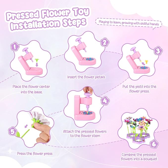 - With Drawstring Storage Bag, Makes Organizing Easy: Say goodbye to messy creations and lost parts! this DIY flower press kit comes with a felt drawstring storage bag, specially designed to keep all small pieces—like petals, stems, flower holders, and buds—neatly stored and secure. Your child can easily tidy up on their own after playing, helping to build lasting organizational habits. Keep all accessories together and make cleanup a fun part of the creative process