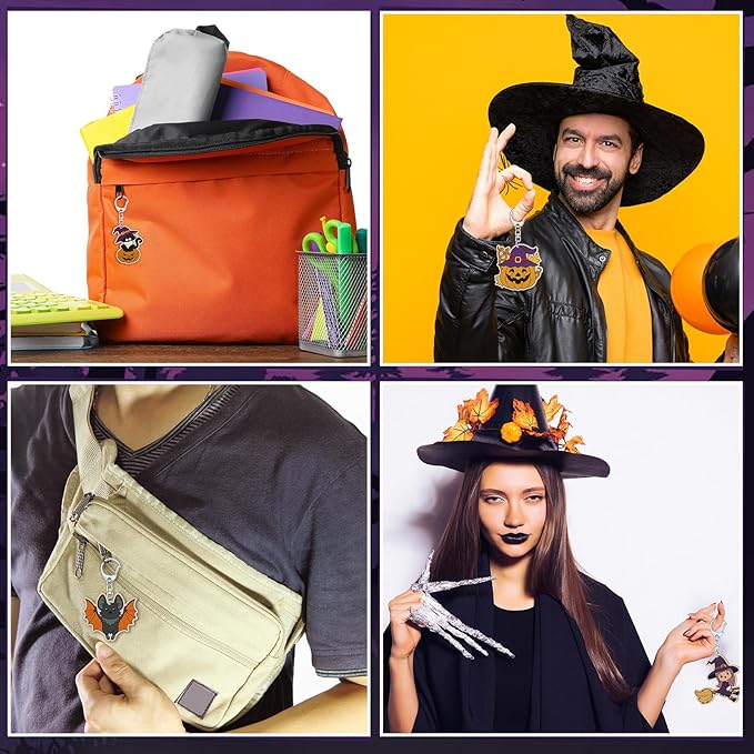 - Exquisite Halloween Design: these Halloween decorative keychains are decorated with classic Halloween elements, such as pumpkins, ghost, spider, witch, bat and haunted house and more; The design is exquisite and eye catching; The card design corresponds to the keychain, using the classic Halloween black, purple color, with a place to display the keychain in the middle, which is easy to attract your attention