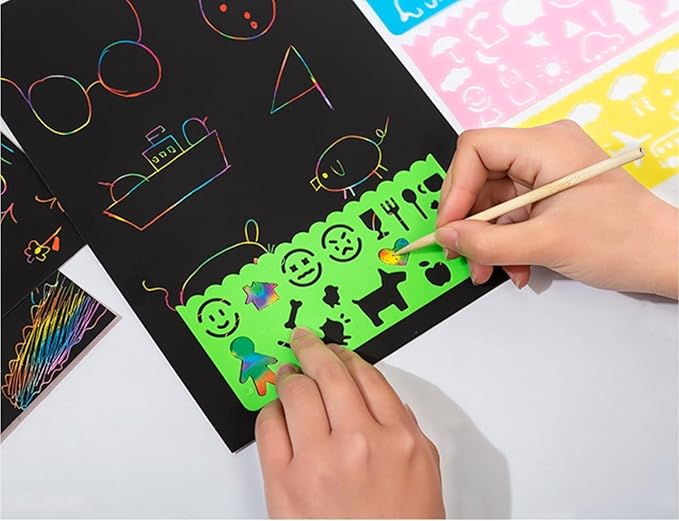 - COMPLETE KIT: Set of 50 drawing stencils with rainbow scratch paper, perfect for creative art activities and group projects