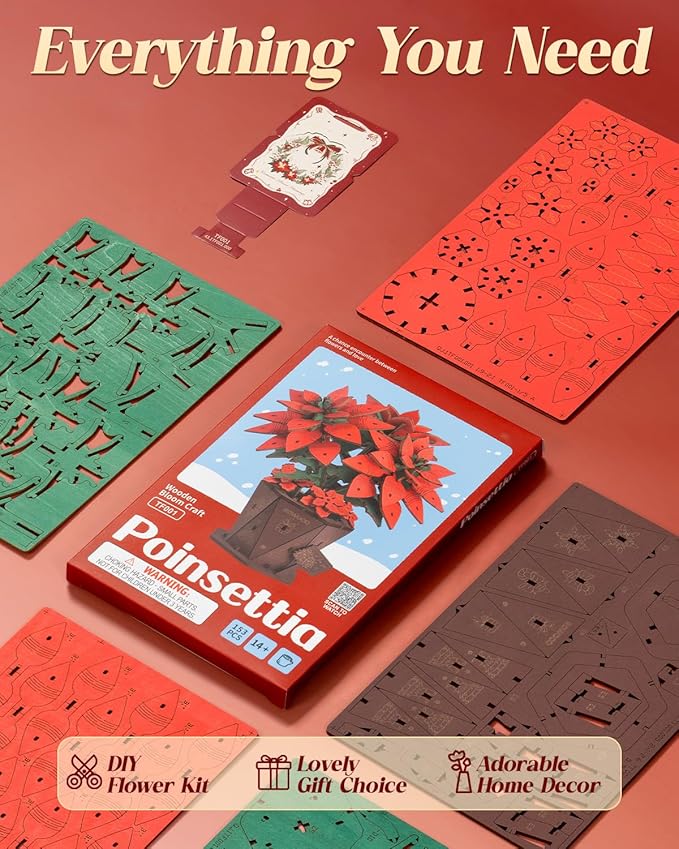 - 【Wooden Puzzle Poinsettia】As the iconic Christmas star, Poinsettia symbolizes unity, gratitude, and the timeless joy of seasonal gatherings. Send the Wowood 3D wooden puzzle Poinsettia to your favorite person during Christmas to symbolize that love never fades, spreading warmth and merriment all year round.