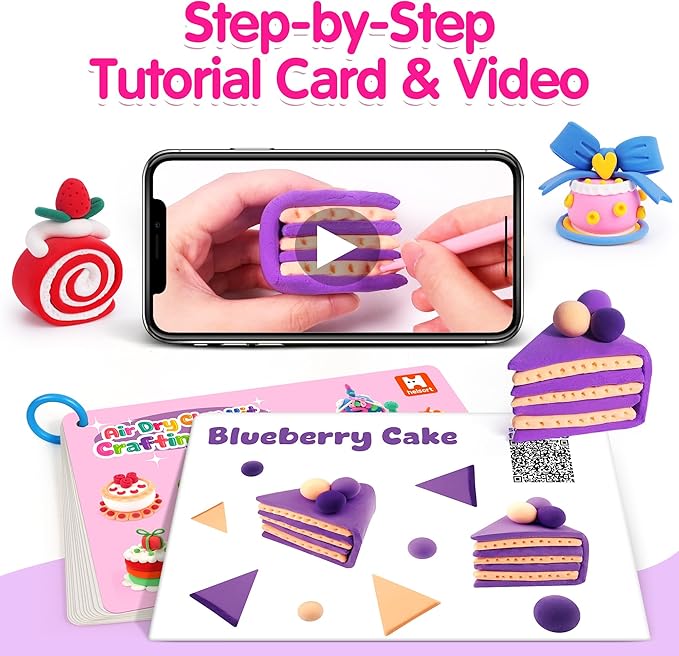 - Easy Step-by-Step Learning: Our craft clay kit comes with detailed tutorial cards and professional video instructions. Helps kids sculpt the same adorable cakes shown on the box—or create their own unique desserts. Ideal for beginners and kids just starting their creative journey.