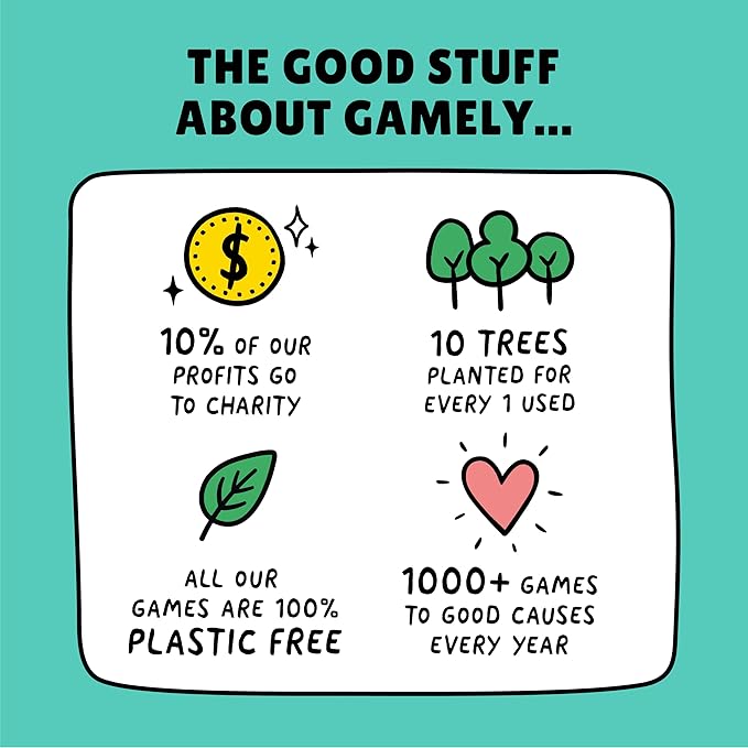 - GREAT FUN AND GOOD FOR THE WORLD. When you buy a Gamely game, you’re not just buying a super-fun party game but also doing good for the world. We make our games as eco-friendly as we can, donate 10% of profits to charity, plant 10 trees for every 1 used and donate 1000s of games to charities and good causes each year.