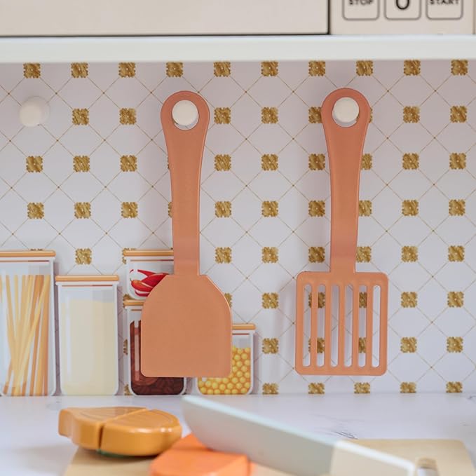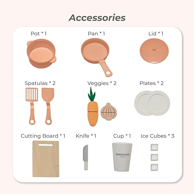 - 15-Piece Kitchen Accessory Bundle Included: No need to buy extras—this wooden kitchen set comes complete with 15 durable accessories including a toy pot, pan, cutting board, spatula set, plates, cup, knife, pretend vegetables, lid, and more. Perfectly sized for small hands, these toys let your mini chef start cooking and pretending right out of the box.