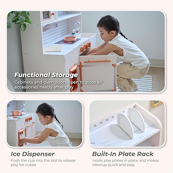 - Built-In Storage Teaches Organization: Teach kids to tidy up and stay organized with built-in double shelves, a storage cabinet, and a stylish plate rack. After each play session, children can easily store accessories and keep their play space neat. This helps develop responsibility while supporting Montessori-style learning at home.