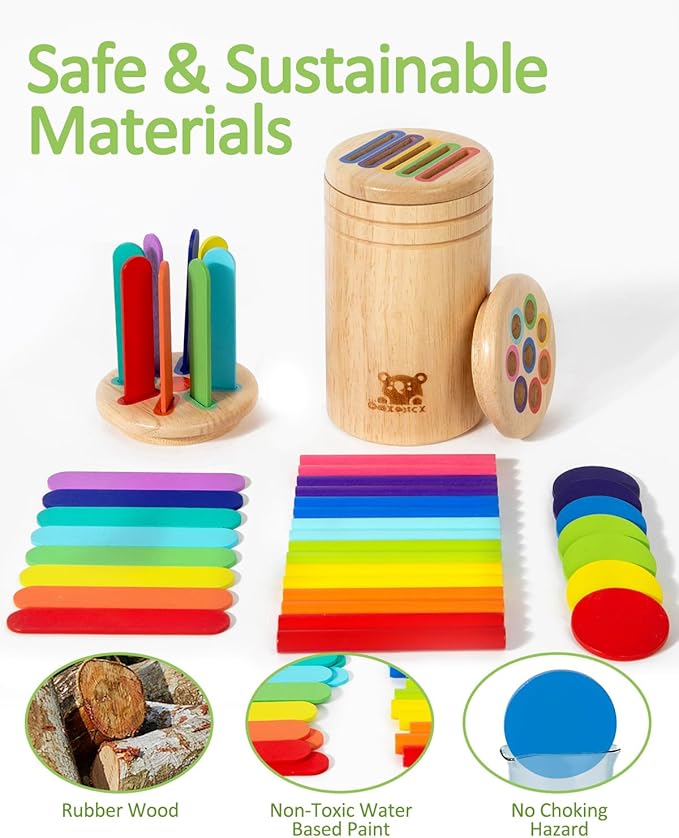 - Smooth Finish, Toddler-Friendly Design-Crafted from quality wood with a finely sanded surface and vibrant water-based coloring, this toy is thoughtfully sized for little hands. It complies with US toy safety standards, making it perfectly suited for Montessori-inspired, wood, and sensory toys for toddlers 1-3. No rough edges, no sharp parts—only worry-free learning fun.