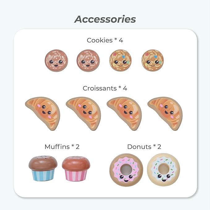 - 12 Hand-sized Pastry Pieces: Includes croissants, cookies, muffins and donuts crafted in durable, non-toxic materials to encourage creative sorting, serving, storytelling, and early numeracy in pretend market setup.