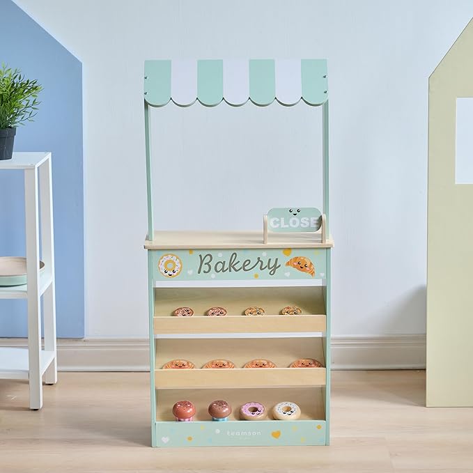 Teamson Kids Jolly Pals Wooden Bakery Market Stand Pretend Playset for Kids Ages 3+, Pastry Play Food Rotating Open/Close Sign, Hidden Storage Educational Role-Play, Pretend Play Wooden Market Stall