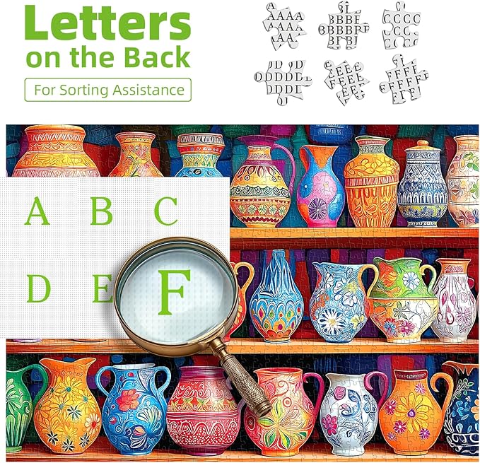 - Vibrant Vase Shelf Scene:Dive into a world of color with a rainbow of hand-painted vases (orange, blue, green, purple) on wooden shelves, each with intricate floral and geometric patterns. Every detail (brushstrokes, vibrant hues, shelf texture) makes this pretty puzzle a joy to assemble
