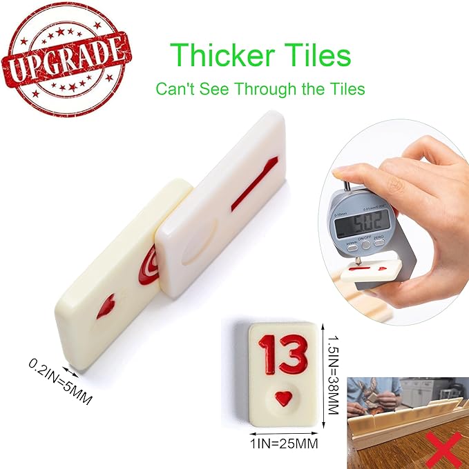 - UPGRADED MODEL: Thicker Melamine Tiles, Hard to Look Through The Rummy Tiles and See The Numbers, No Cheat More Fun. The Premium Velvet Drawstring Bag and Portable Heavy Duty Carrying Case is Great for Storage and Travel. The Soft Felt at The Wooden Rack Bottom is Not Only Non-Slip, But Also Protects Your Table From Scratches and Prevents Large Noise.
