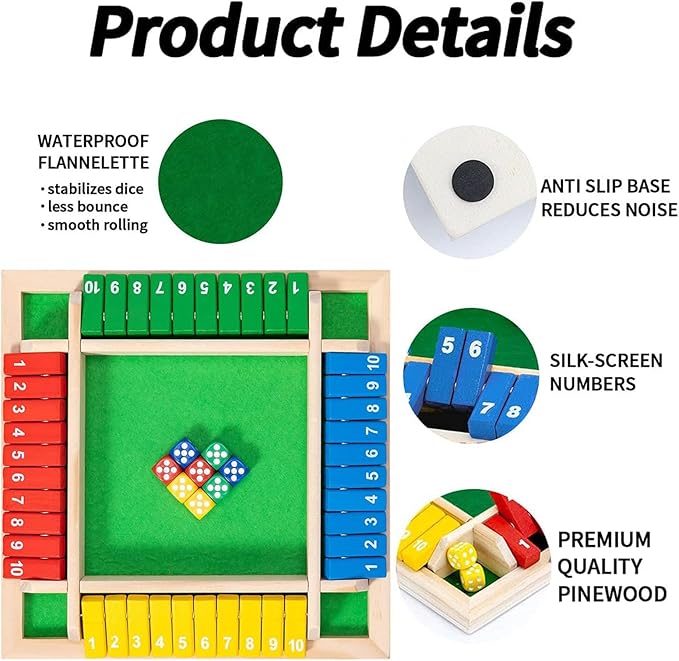 - ► [Games also have educational value] shut the box and up to 4 players can play at the same time. Teach children basic addition, subtraction, multiplication, and/or division and improve their strategic thinking, allowing them to learn and grow in happiness.