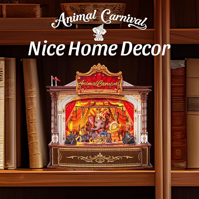 - Animal Carnival - 3D Wooden Puzzles Theater Model Set - Do you recall the joy of childhood carnivals? Twinkling lights, cheerful music, tiny stages—every show was magical. This Animal Carnival Wooden Theater Music Box brings those memories back. As you hand-assemble the stage, you're not just building—you're reliving moments of pure delight. When the melody plays, time seems to slow, and happiness feels simple again.