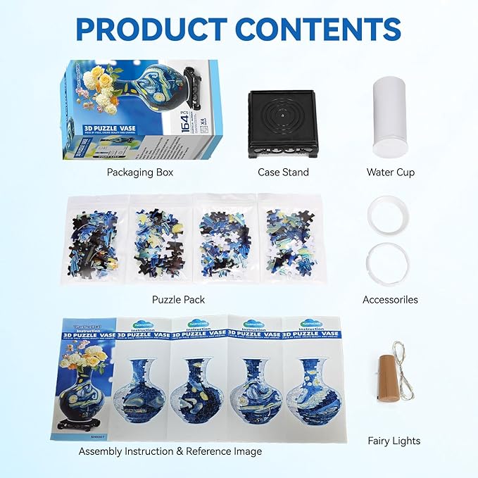- 【Unique 3D Puzzle Vase with LED Light】Made by 164-piece 3d curved puzzle pieces with a water column.The finished vase size is 5.1 inches in diameter and 8.2 inches in height.An ideal choice for those seeking challenging and educational 3D puzzles for adults.The puzzle vase with LED lights, which brings a richer visual effect to the vase puzzle. Turn on the LED light switch in the evening or when the lights are turned off, it can add a touch of light and atmosphere to your room.