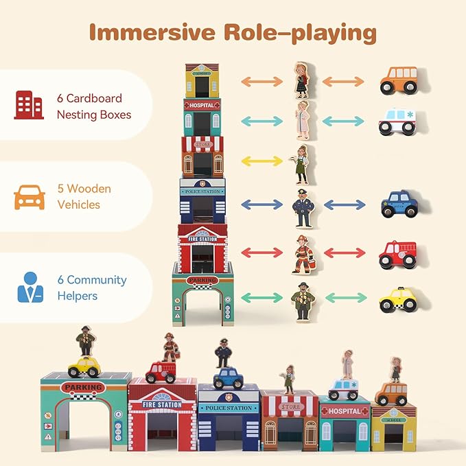 - SORTING AND STACKING TOYS: This set includes 6 scene nesting boxes, 6 wooden community helpers and 5 matching vehicles, corresponding to fire station, police station, grocery shop, hospital and school scenes, an extra-large parking garage nesting box parking for all vehicles. All pieces stack or nest neatly for easy building and storage