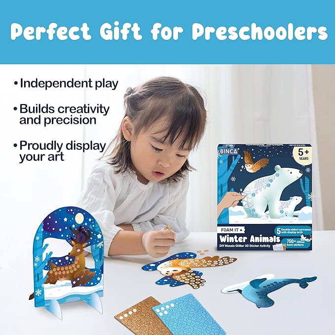 BINCA Foam Sticker Mosaic Art Activity, 750+ 3D Glitter Foam Stickers, 5 Winter Animals with Display Arch, DIY Mess-Free Activities, Felt Craft Kits & Gifts for Boys & Girls Ages 5,6,7,8