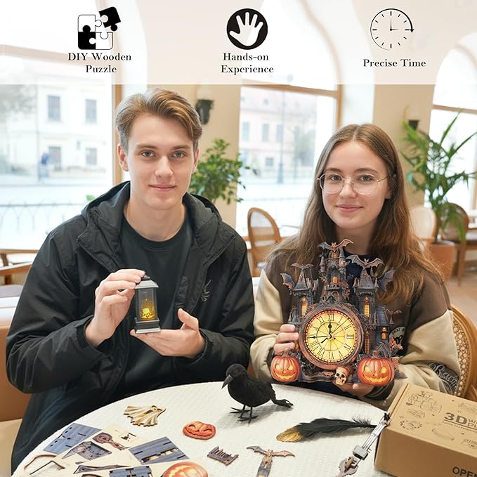 - 【3D Puzzles for Adults】Build a stunning mechanical clock with this intricately designed DIY clock kit, featuring a three-dimensional Halloween cottage motif and roman numeral dial. Perfect for hobbyists seeking challenging 3D puzzles that combine artistry with engineering.