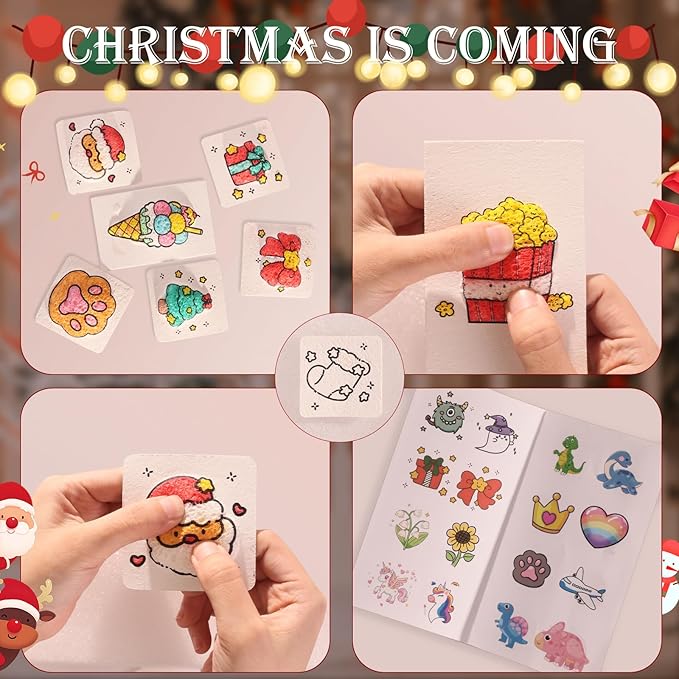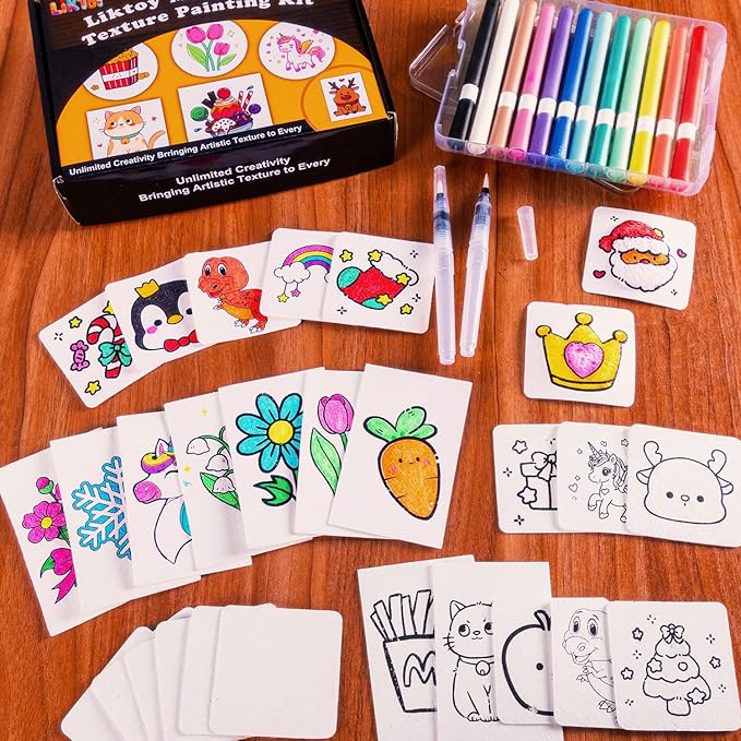 Liktoy 44Pcs Magic Foam Texture Painting Kit, 28Pcs Foam Texture Paper, 12 Colorful Brush, 2 Water Brushes, 3D Effect Texture Painting Set, Ideal for Halloween, Christmas, Birthday Gifts